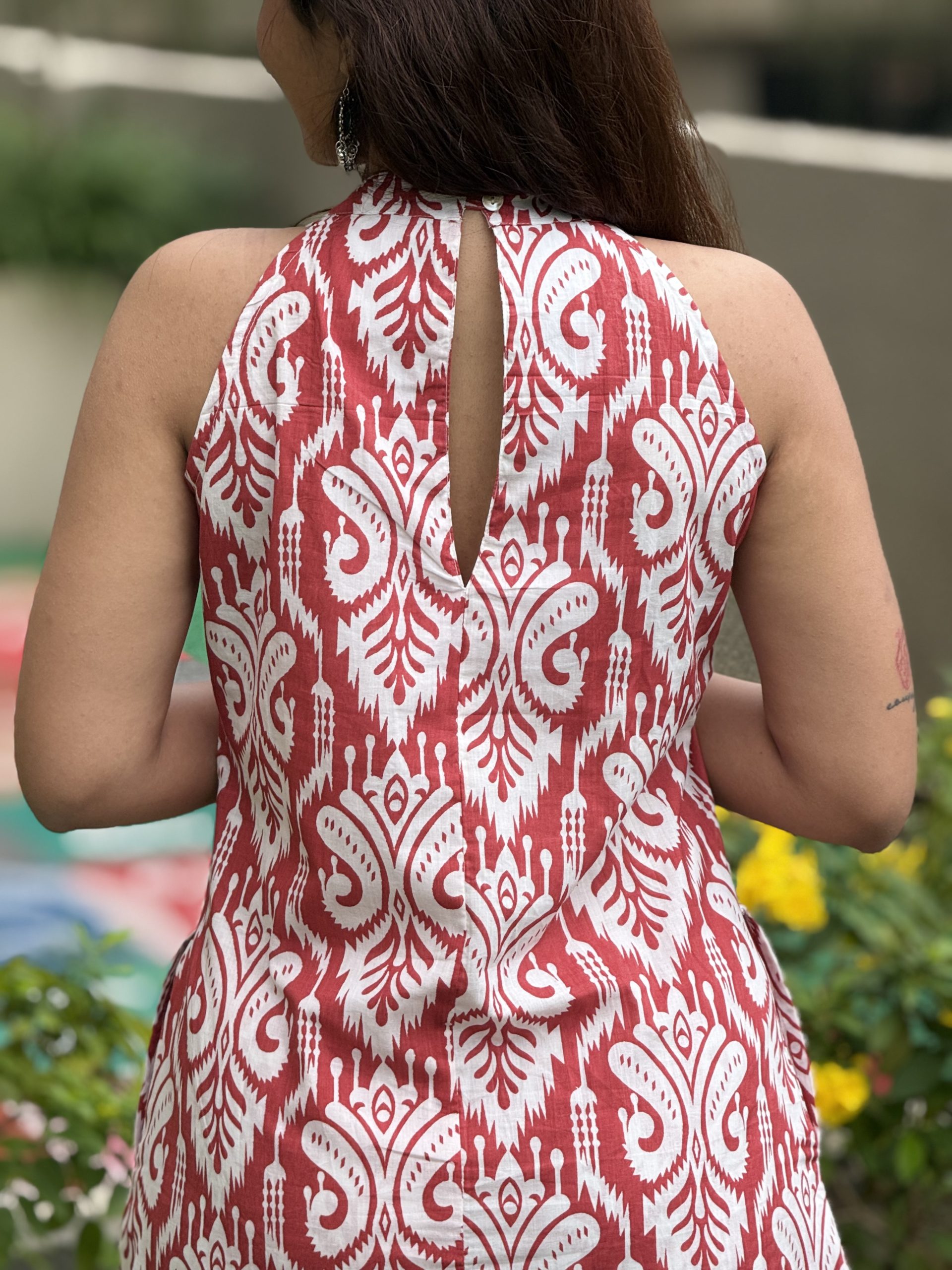 Elegant holter sleeveless outfit featuring a beautiful red and white ethnic print. Designed with a stylish neckline and comfortable fit, this set offers a perfect blend of traditional charm and modern style. Ideal for casual outings, festive gatherings, and day events. Lightweight fabric ensures all-day comfort with effortless elegance.